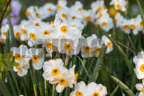 - Narcissus poeticus var. poetarum: En sort med elegante, hvide kronblade og en lille, gul korona med rød rand.