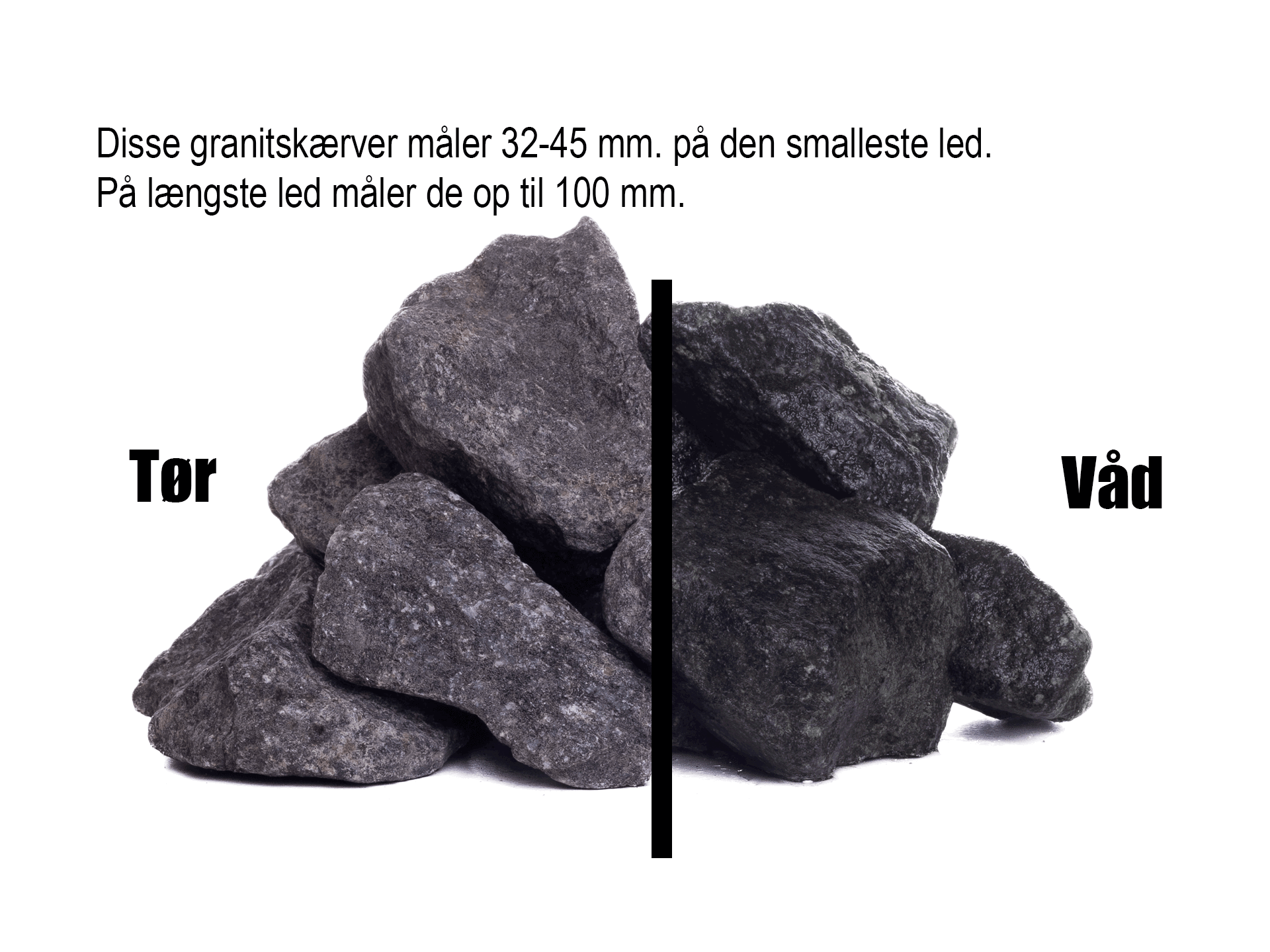 Sorte granitskærver i størrelsen 32-45 mm.